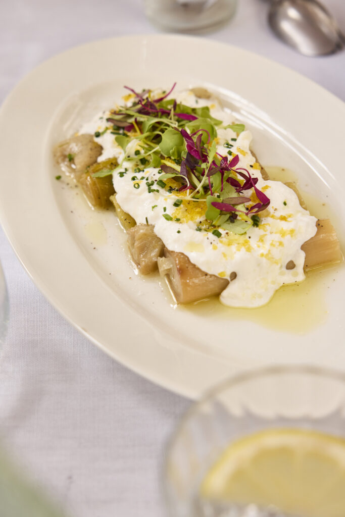 La carta mezcla ADN de grupo con novedades pensadas para este espacio. Conviven clásicos como la croqueta de pollo rustido, los macarrones a la Cardenal con carrillera ibérica o las albóndigas Strogonoff con platos que ya huelen a hit de la casa: los puerros confitados con stracciatella y botarga, la ensaladilla rusa con gamba o la viciosa gamba de cristal crujiente, que pide vermut y segunda ronda.