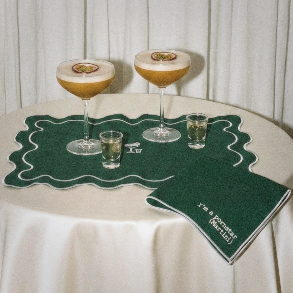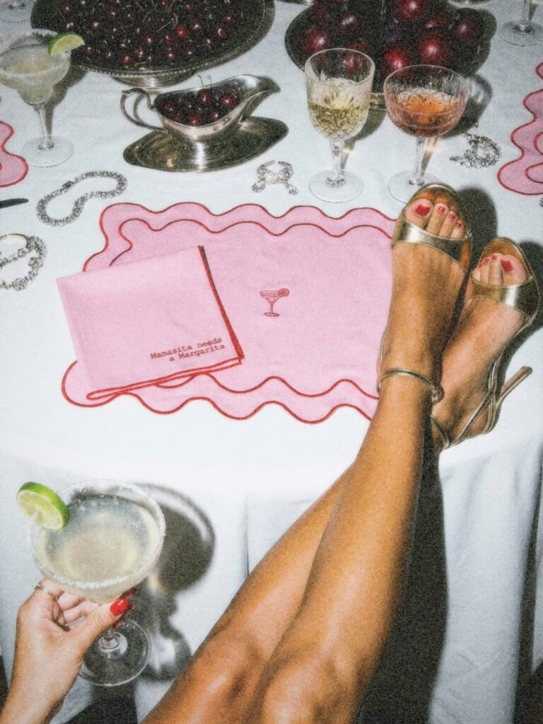 Una de nuestras top choices es la colección Cocktail Club, una serie de manteles individuales chulísimos pensados para el momento cóctel, que funcionan casi como pequeños posavasos de lujo. Cada uno lleva bordado el dibujo del cóctel y su nombre, desde un Old Fashioned hasta un Pornstar Martini. Un gesto que eleva cualquier girl dinner bastante por encima del típico posavasos de publicidad que todxs tenemos por casa.