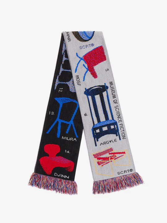 To give: No, no es para nada lo que se te viene a la cabeza cuando piensas en regalar una bufanda, porque esta es todo un objeto de culto. SCRT, la firma londinense obsesionada con las subculturas, firma una pieza que parece salida de un archivo de futuros posibles. De su colección AW25 Museo de Ciencia Ficción, llega la Bufanda Objetos con un estampado magnético donde aparecen bordadas sillas icónicas del diseño. Se supone que los accesorios le dan ese extra que piden los look más básicos y te hacen reconocible, pero es que esto es otro nivel.