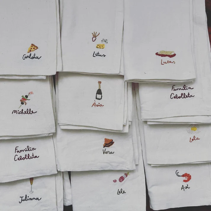 Detrás del proyecto está Inés de Sastre, que trabaja exclusivamente con telas de algodón y lino reutilizadas, rescatadas de antiguos hogares del Alt Empordà y Francia. Cada mantel, cada servilleta y cada pieza nace con una historia previa y encuentra otra nueva al pasar por sus manos. Todo se borda de forma artesanal, sin intermediarios y con una filosofía muy clara: no producir más, sino dar una segunda vida a lo que ya existe. El resultado son piezas únicas, pensadas para llenar de alma un hogar o incluso aportar un toque especial a una boda.