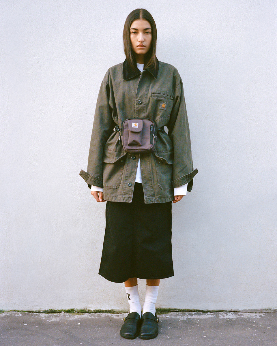 Pese a mirar con melancolía al pasado, la firma neoyorquina explora nuevas adaptaciones dando vida a híbridos entre lo icónico y lo nuevo. Es el caso de la falda Maeve, la cual hace un guiño claro al Double Knee Pant con paneles y remaches metálicos. O la chaqueta Clapton, que se inspira en el Michigan Coat, pero con lona de nailon y bolsillo adicional en la manga. Por último, esta entrega ofrece una versión sutilmente oversize de la Detroit bajo el nombre de chaqueta Clark.