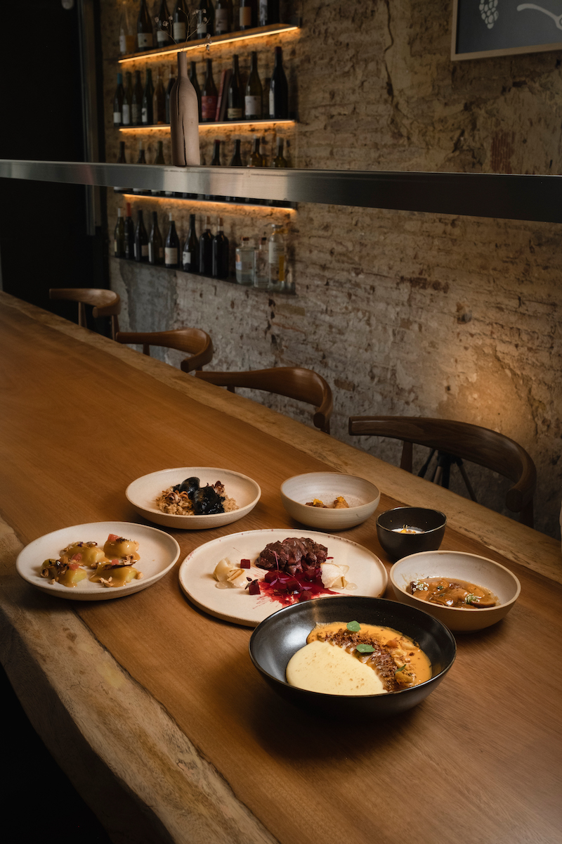 Desde ahí, el menú de invierno se despliega como un viaje gastronómico que transporta sin moverse del Born. Desde las montañas d’Ordal, pasa por las Guilleries, se asoma a la Barceloneta y hace parada en el Delta, trazando un mapa delicioso de los paisajes que rodean Barcelona. En el plato, la temporada se expresa sin artificios y en forma de manjar: ensalada de invierno con alcachofa, calçots y kale; raya en salsa verde con alcaparras e hinojo; caldo vegetal con miso de pan; arroz meloso de calamar mar y montaña o un fricandó de ciervo que encuentra en el invierno su mejor contexto.