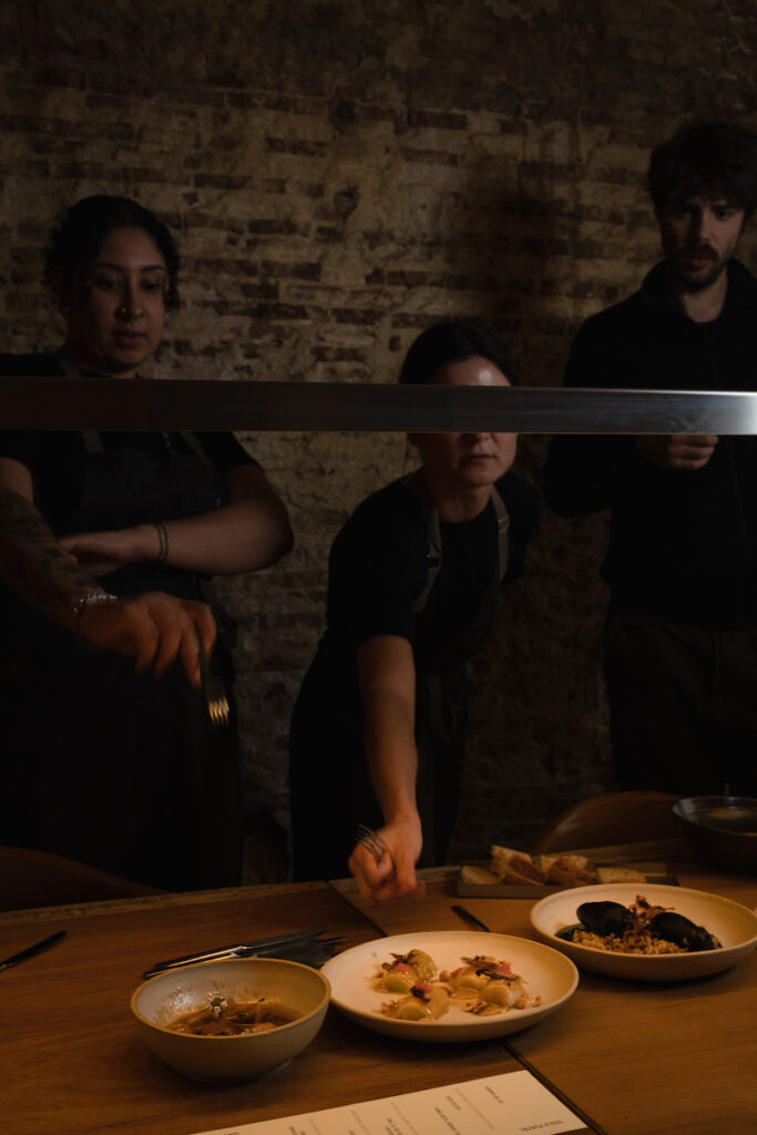 En Taula Puntal la experiencia no empieza con una carta al uso, sino con una hoja de ruta bien afinada: sentarse, compartir y dejarse llevar. Todo el mundo come lo mismo, al mismo ritmo, alrededor de una única mesa que funciona como el verdadero corazón del restaurante y la propuesta. La taula, protagonista absoluta, está servida y te invita a seguir un recorrido pensado de principio a fin. El resto de elementos del espacio, diseñado íntegramente por el propio equipo con intención, envuelven y acompañan ese viaje con la misma coherencia. Todo el ambiente refuerza esa conexión entre territorio, gesto y relato. Comer aquí es asumir un tempo común y formar parte de un gesto colectivo que conecta con la cultura de los txokos vascos y con una manera muy concreta de entender la experiencia gastronómica: como un camino compartido.