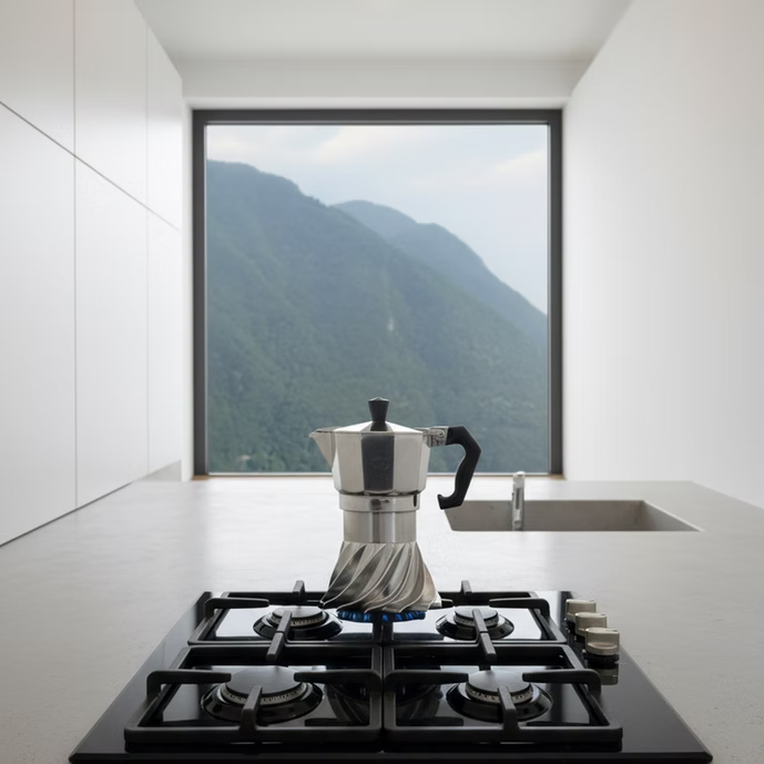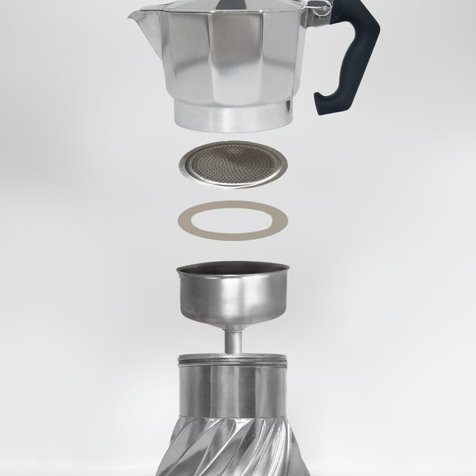 Lo interesante es que no rompe el gesto clásico: el café sigue saliendo desde abajo, sigue existiendo ese momento de espera y mantiene el aroma propio de Moka de toda la vida. Pero ahora ocurre antes, con menos energía y con una pieza que no desentona ni en una cocina minimalista ni en un estudio de diseño. Su geometría no es solo para llamar la atención —que también—, sino que está pensada para rendir mejor. Una decisión técnica que se nota sin que nadie te lo explique.
