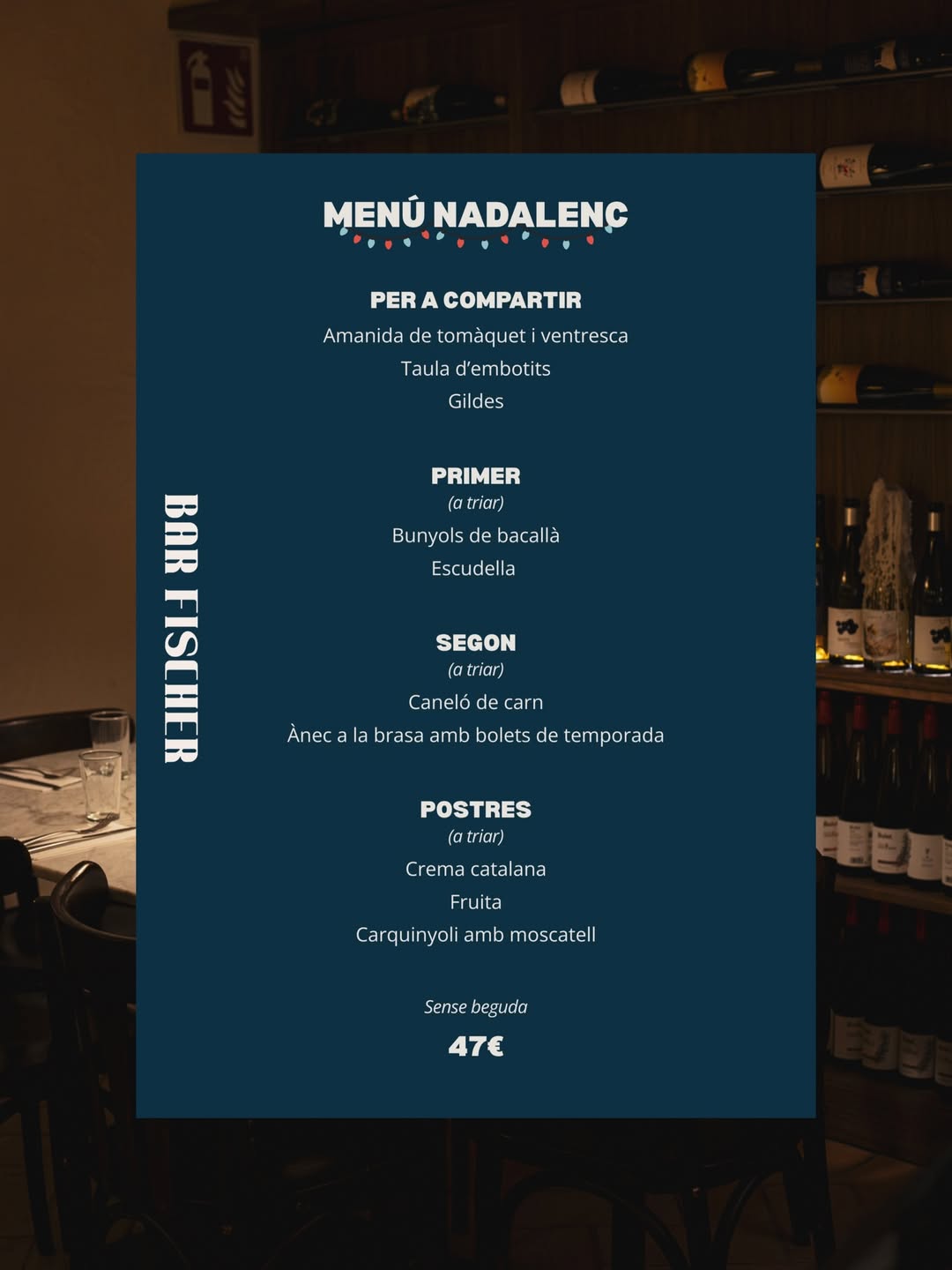 Para estas fechas, Fischer propone un Menú Nadalenc que cumple con lo esencial (escudella, canelón, ànec a la brasa, crema catalana…) sin hacerte echar de menos la comida casera. Tiene los imprescindibles, sí, pero bien ejecutados, con ese punto de calidad que permite celebrar como toca. Es el lugar perfecto para reunir al grupo antes de que el calendario se estreche, los compromisos familiares se multipliquen y ya no quede hueco ni para un plato más. Una cena de diciembre que sabe a Navidad, pero también a ciudad, a temporada y a ganas de verse.